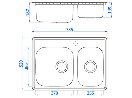 型號(hào):623款式:雙盆安裝方式:嵌入式總尺寸:735*520 mm大盆:370*385*187 mm小盆:255*385*149 mm