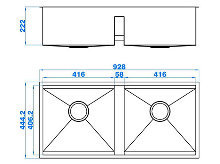 型號(hào):5159款式:雙盆安裝方式:臺(tái)底式總尺寸:928*444.2 mm雙盆:416*406.2*222 mm